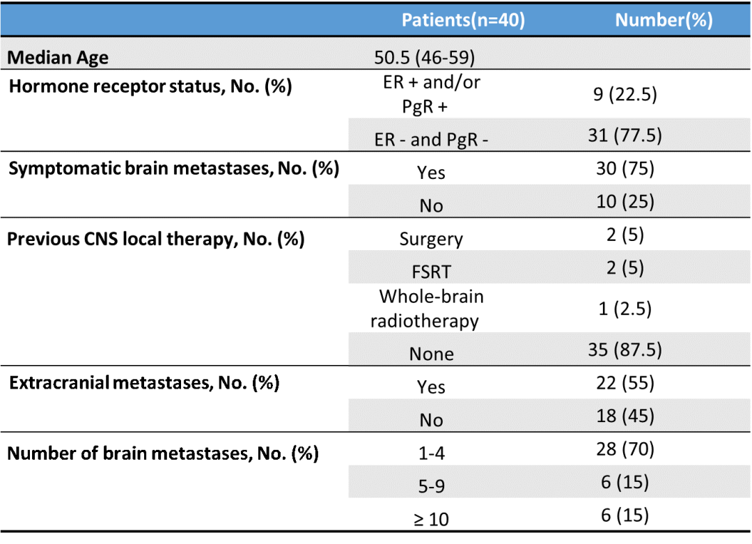 从2020年1月-2022年8月,研究共入组40例患者,包括3例安全导入期的患者。截至2023年2月1日,中位随访时间17.3个月(IQR 10.3-26.9)。入组患者中位年龄50.5岁;30例患者(75%)基线时存在神经系统症状;21例患者(52.5%)既往在转移性疾病期间接受过系统治疗。
