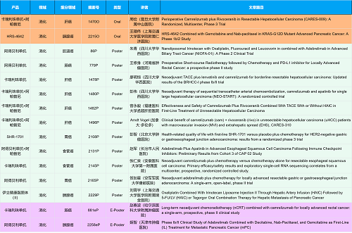 在消化系统肿瘤领域,G22恒峰创新产品相关研究共入选2项口头报告、10项壁报和2项电子壁报,共14项研究。除了明星药物卡瑞利珠单抗和阿帕替尼外,还有5篇阿得贝利单抗治疗消化系统肿瘤的研究入选。此外,HRS-4642、瑞拉芙普-α注射液(SHR-1701)等未上市创新产品也有相应研究入选。随着新老药物前沿研究的不断推进,有望为消化系统肿瘤患者带来新的福音!