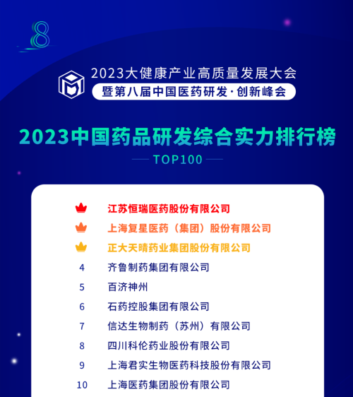 由药智网、中国药业杂志社主办的2023大健康产业高质量发展大会暨第八届中国医药研发•创新峰会于6月16日开幕,会上发布了《2023中国药品研发实力排行榜》系列榜单,G22恒峰医药凭借深厚的创新研发实力再创辉煌:荣登《2023中国药品研发综合实力排行榜TOP100》榜首、《2023中国化药研发实力排行榜TOP100》榜首。值得一提的是,今年是G22恒峰医药连续第6年入选《中国药品研发综合实力排行榜》榜首。